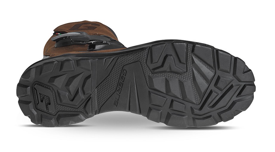 L'esclusiva suola in gomma vulcanizzata è progettata con zone di aderenza distinte per migliorare la trazione e la stabilità su vari terreni, garantendo una guida sicura su terreni diversi, dall'asfalto alle strade sterrate.